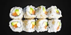 Composition du produit : riz vinaigré, feuille d’algue Nori, saumon, fromage frais, avocat, graines de sésame